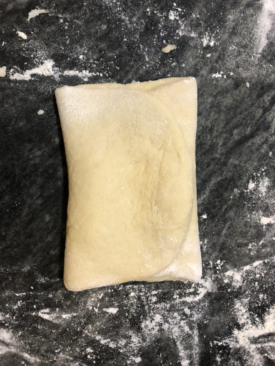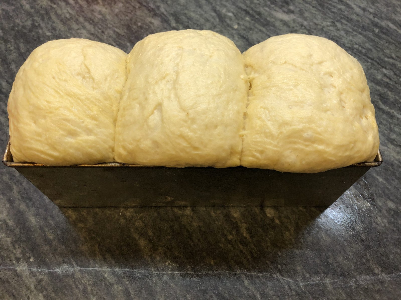 La pesamos y dividimos en tres partes iguales. Estiramos cada porción  con un palo de amasar en forma  rectangular, doblamos hacia adentro los dos extremos de modo tal que se encuentren en el centro, giramos 90 grados y enrollamos. Hacemos lo mismo con las otras dos piezas y colocamos los tres rollos dentro de un molde rectangular pincelado con aceite. Mi molde rectangular es de 25 por 10 cm.   Pintamos el pan con doradura (huevo, un chorrito de leche, una pizca de sal y una cdita de azúcar).