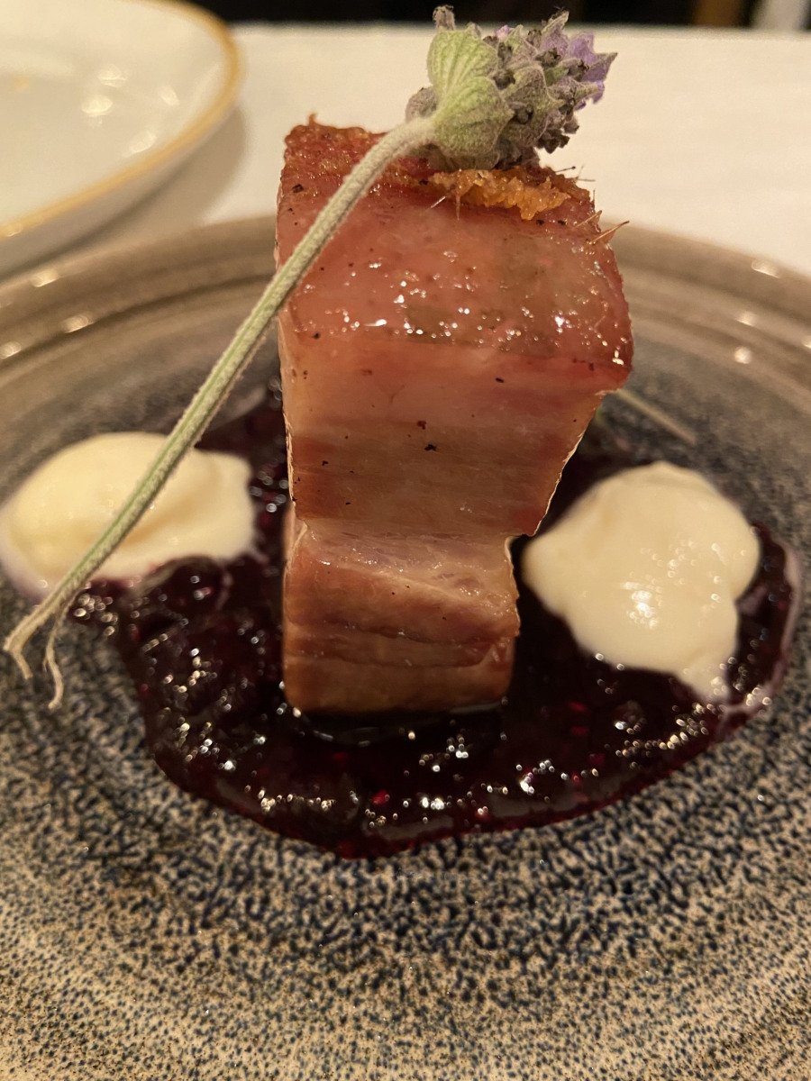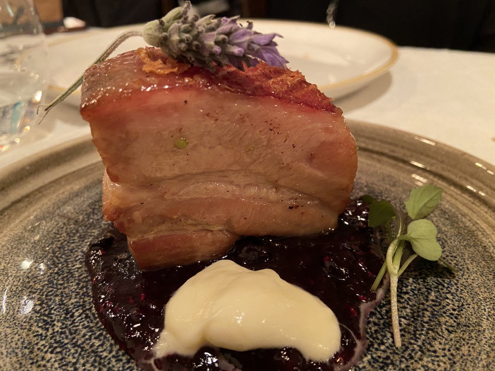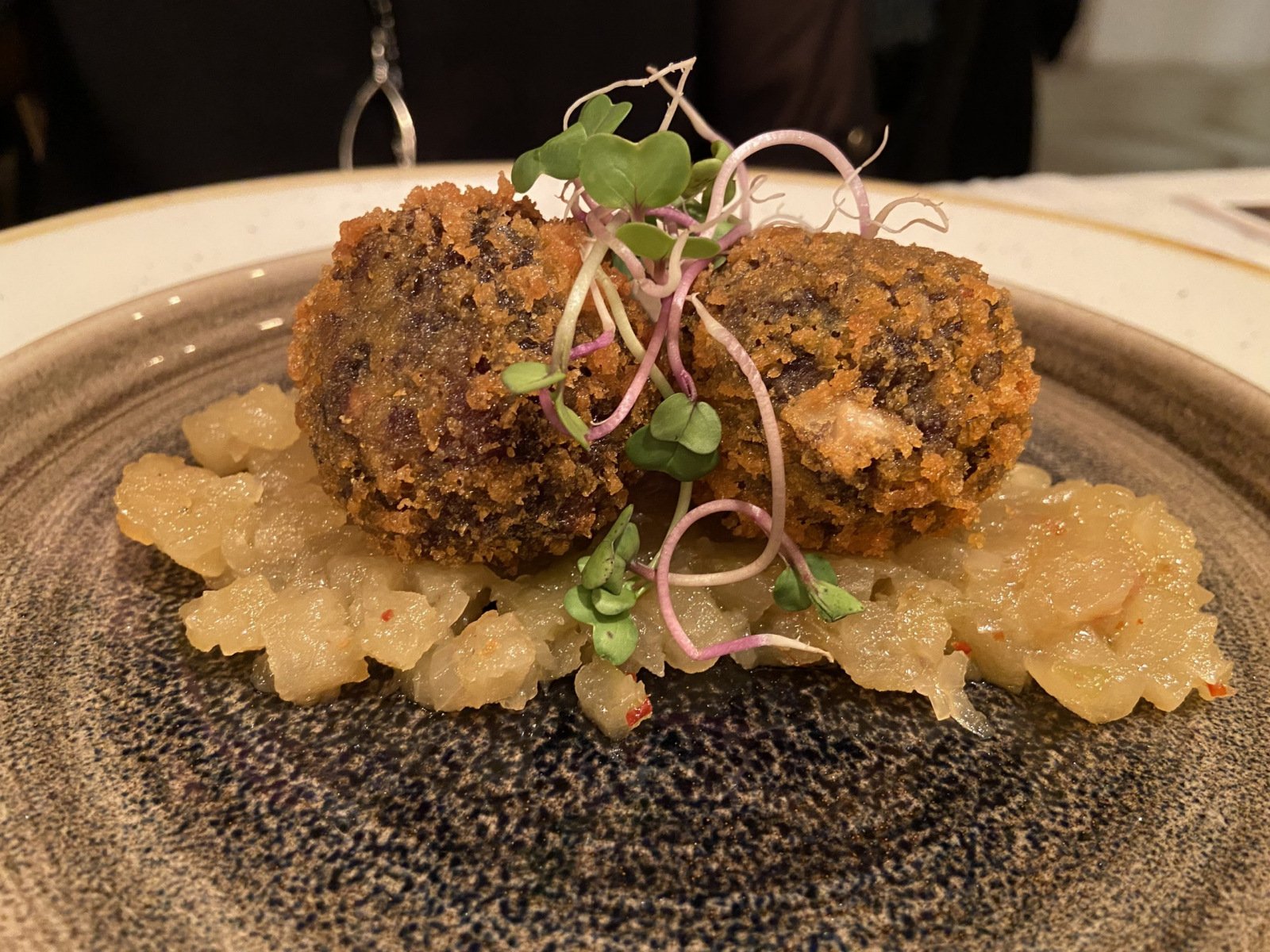 Pedimos de entrada las Croquetas de morcilla con chutney de manzana y el Tostón con panceta cocida en baja temperatura, polpetta tibia, , BBQ de frutos rojos, esponja de menta y cilantro.