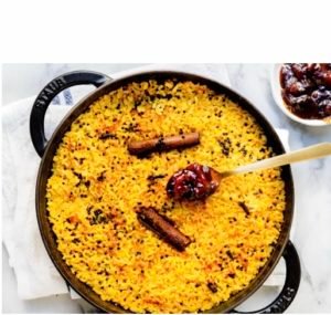 – Precalentar horno a 180 ° C. En un tazón grande mezclar el arroz seco y los porotos Mung (se puede reemplazar por otra legumbre). Enjuagar bien la mezcla con agua y luego escurrir.