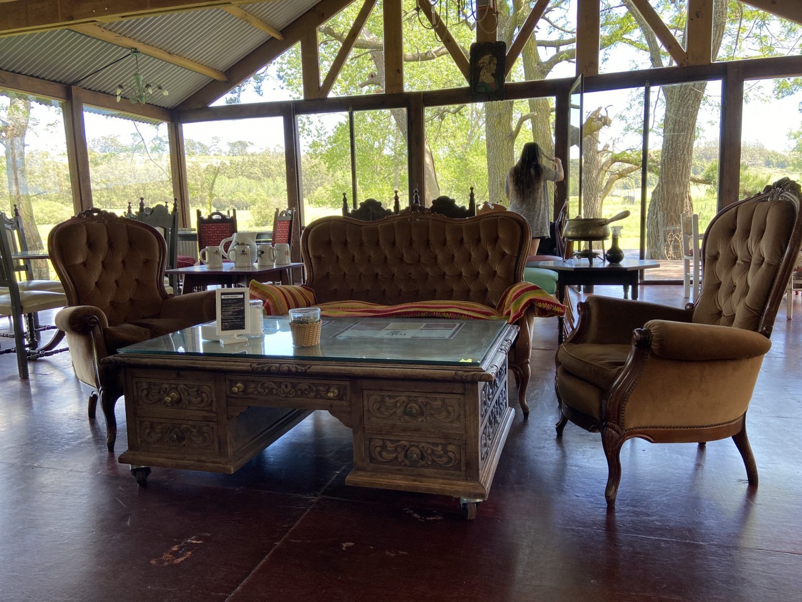 Un salón ecléctico, solo ventanal, una chimenea antigua, carameleras antiguas. La cocina totalmente a la vista. Todo parece salido de un cuadro costumbrista de 1800.