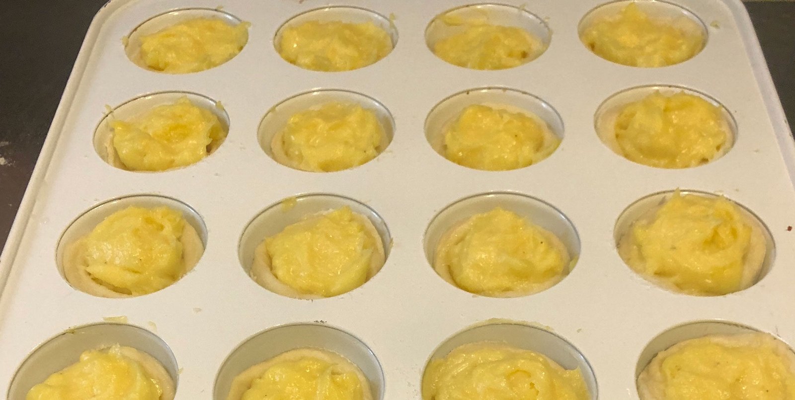 Estiramos el hojaldre un poco con un palo de amasar y lo cortamos con un cortador de galletas de unos 8 cm de diámetro aproximadamente. Deberemos obtener 12 círculos y los colocaremos en los huecos del molde presionando los laterales para que no queden ondulados y cubran bien. Pueden hacerlos de otros tamaños para adaptarse al molde que tengan.