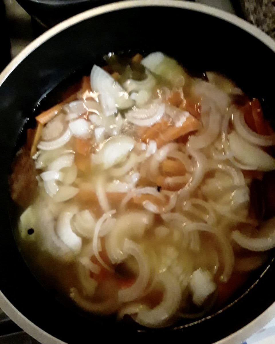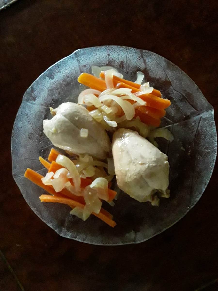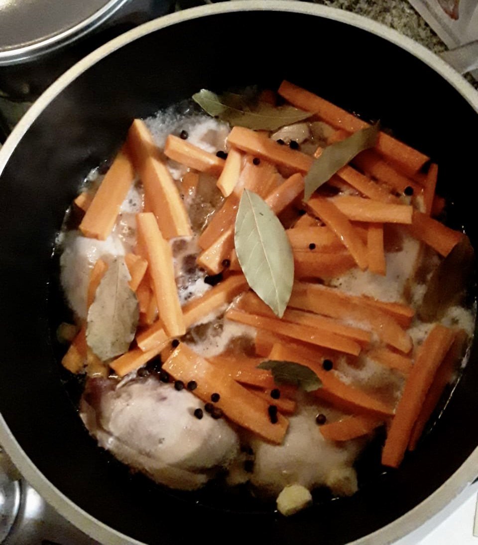 Agregamos los dientes de ajo, las zanahorias cortadas en juliana gruesa, aceite, vinagre de vino, vino blanco, pimienta negra en grano y sal. Cocinamos a fuego lento en cacerola tapada 30/40 minutos.