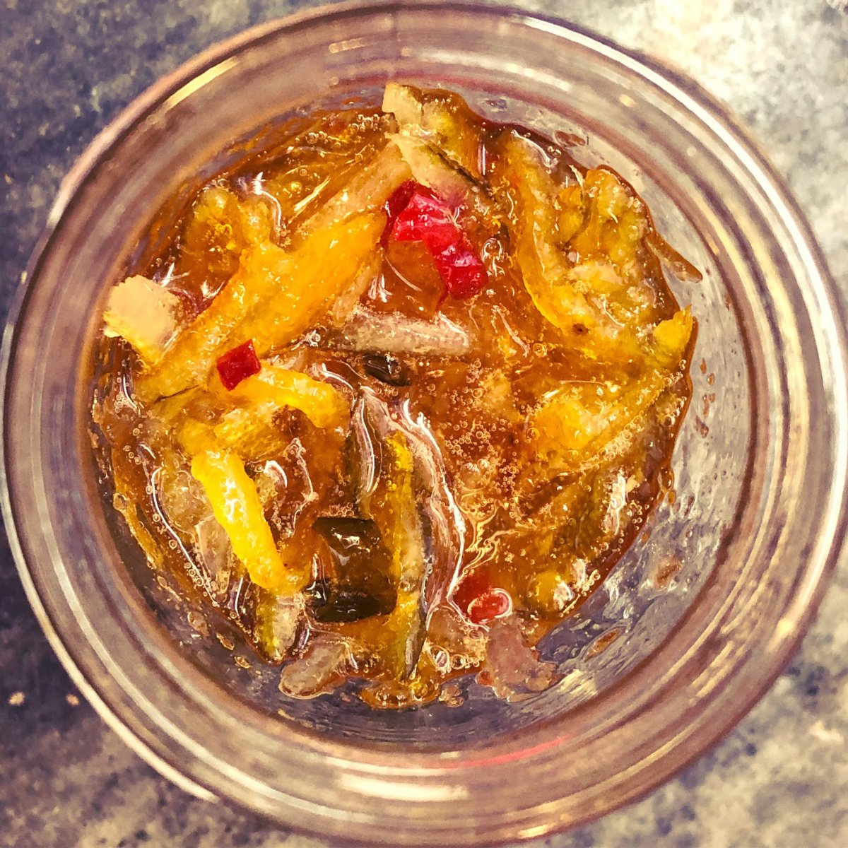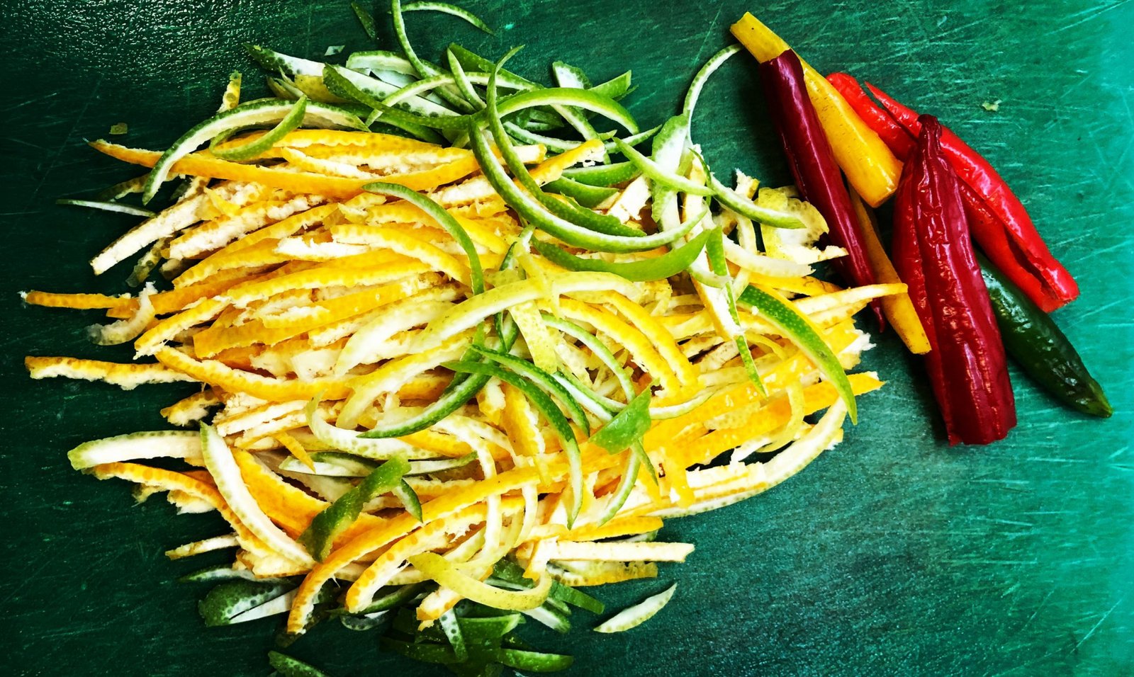 Cortar en tiras muy finitas la piel de los limones y de las mandarinas. Blanquear 4 veces a fuego fuerte partiendo de agua fría. Picar diente de ajo y el jengibre. Desvenar y despepitar los chiles.
