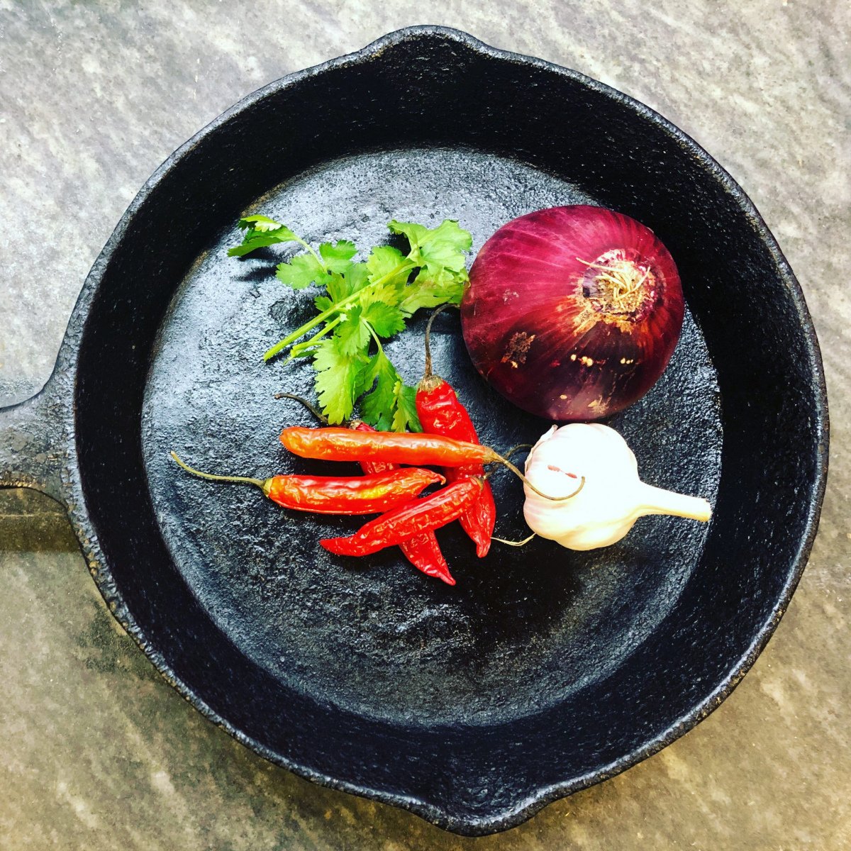 Cortar a grueso modo la cebolla colorada (puede ser de las comunes también), medio morrón rojo y desvenar y despepitar los chiles. Si son más valientes que yo pueden no poner el morrón rojo y dejar solo los chiles. Una vez todo listo, lo ponen juntito en una sartén de hierro bien caliente sin aceite ni nada. Que se empiecen a quemar. Cuando ya toman color quemado (ésto lo regulan Uds) se procesa todo en un robot o minipimer junto el jugo de una lima, la ralladura de jengibre y un puñado generoso de cilantro (lo pueden regular según les guste más o menos el cilantro). Agregar sal y rectificar a gusto. Es una gloriosa salsa