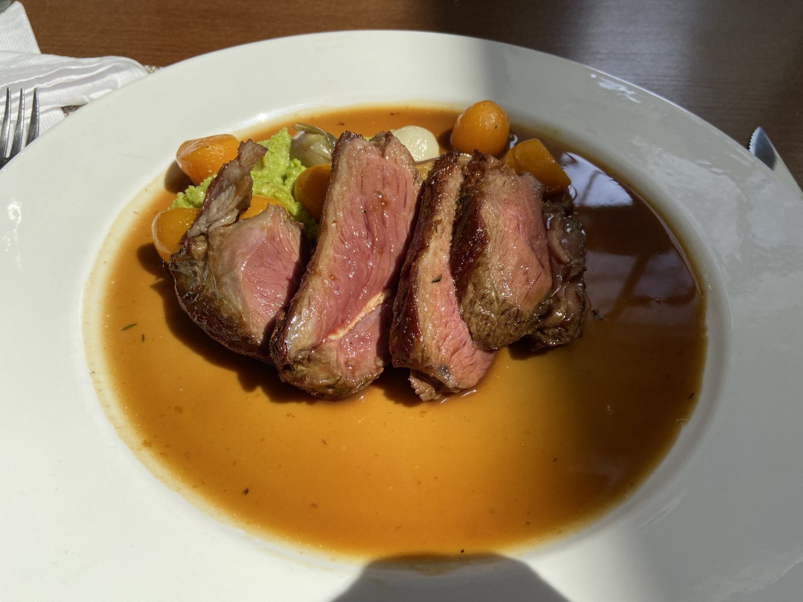 – Degustación de cordero: rack, lomo y pechito. Pesto de arvejas frescas, cebolla de verdeo glaseada, calabaza y jugo de cordero.
