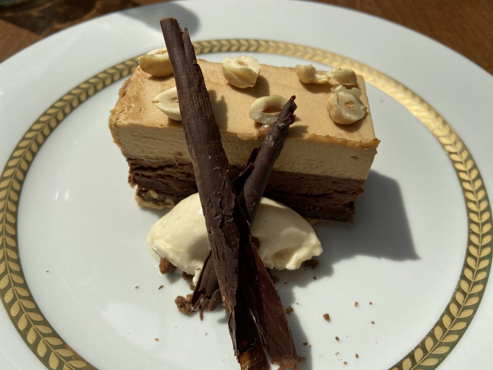 – Chocolate y crema de avellanas: Finas capas de chocolate en distintas texturas y mousse de avellanas.