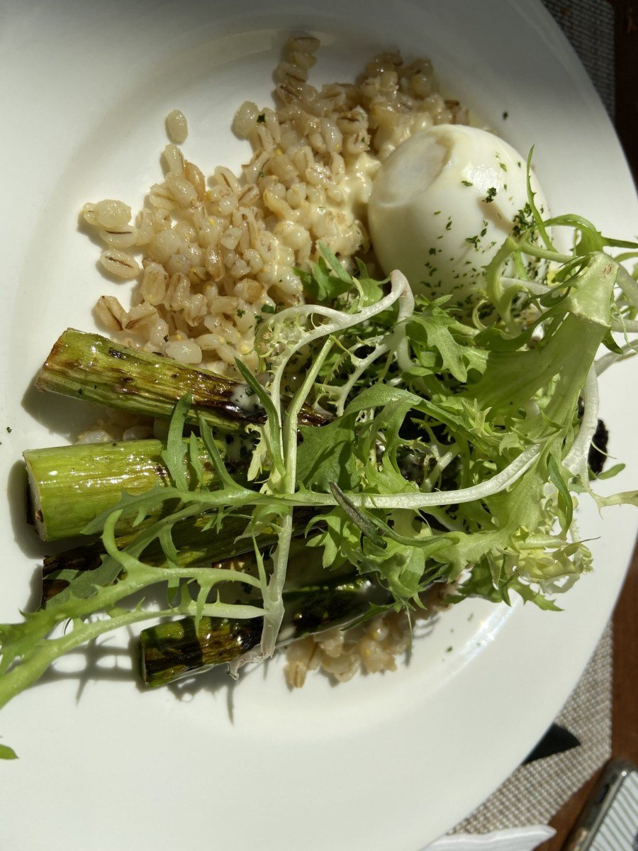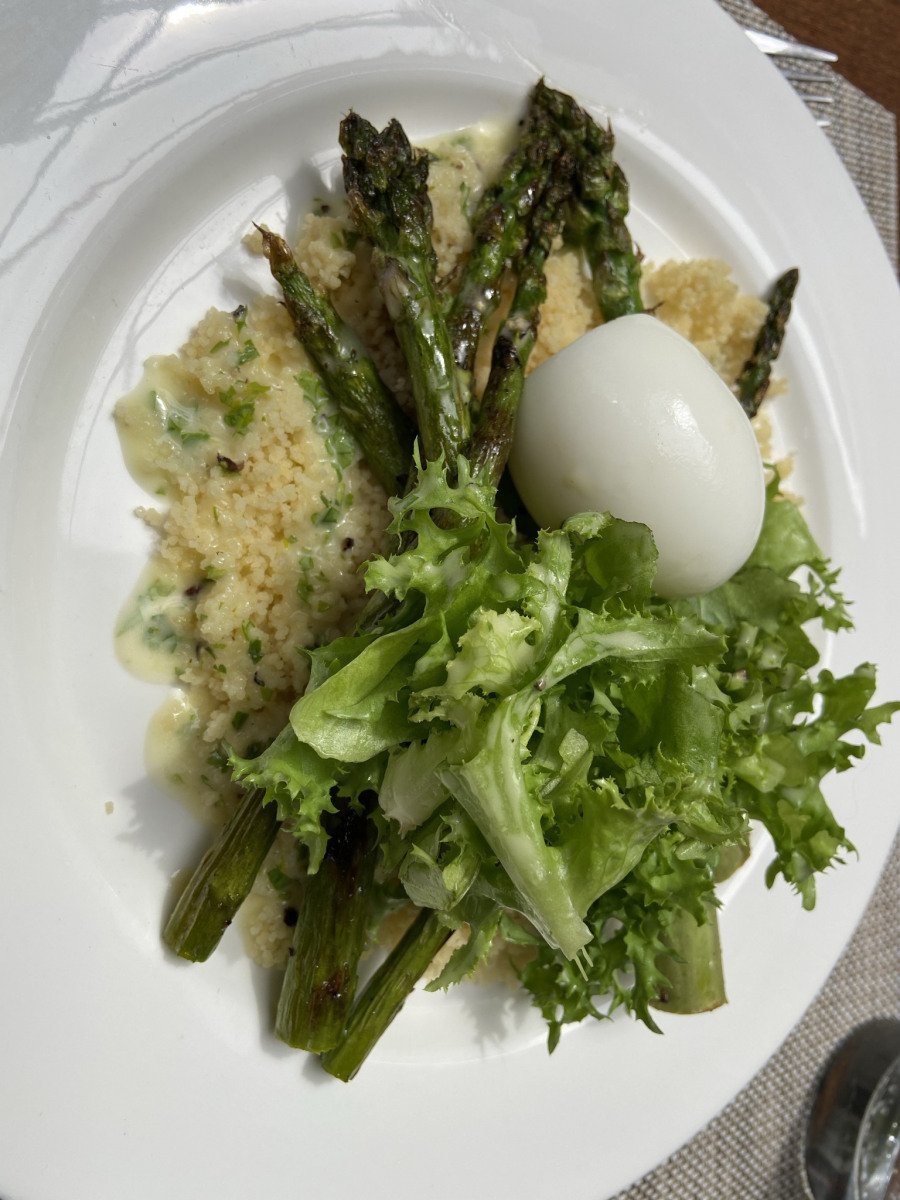 – Espárragos a la plancha, cous cous, escarola, huevo pochado, vinagreta de perejil
