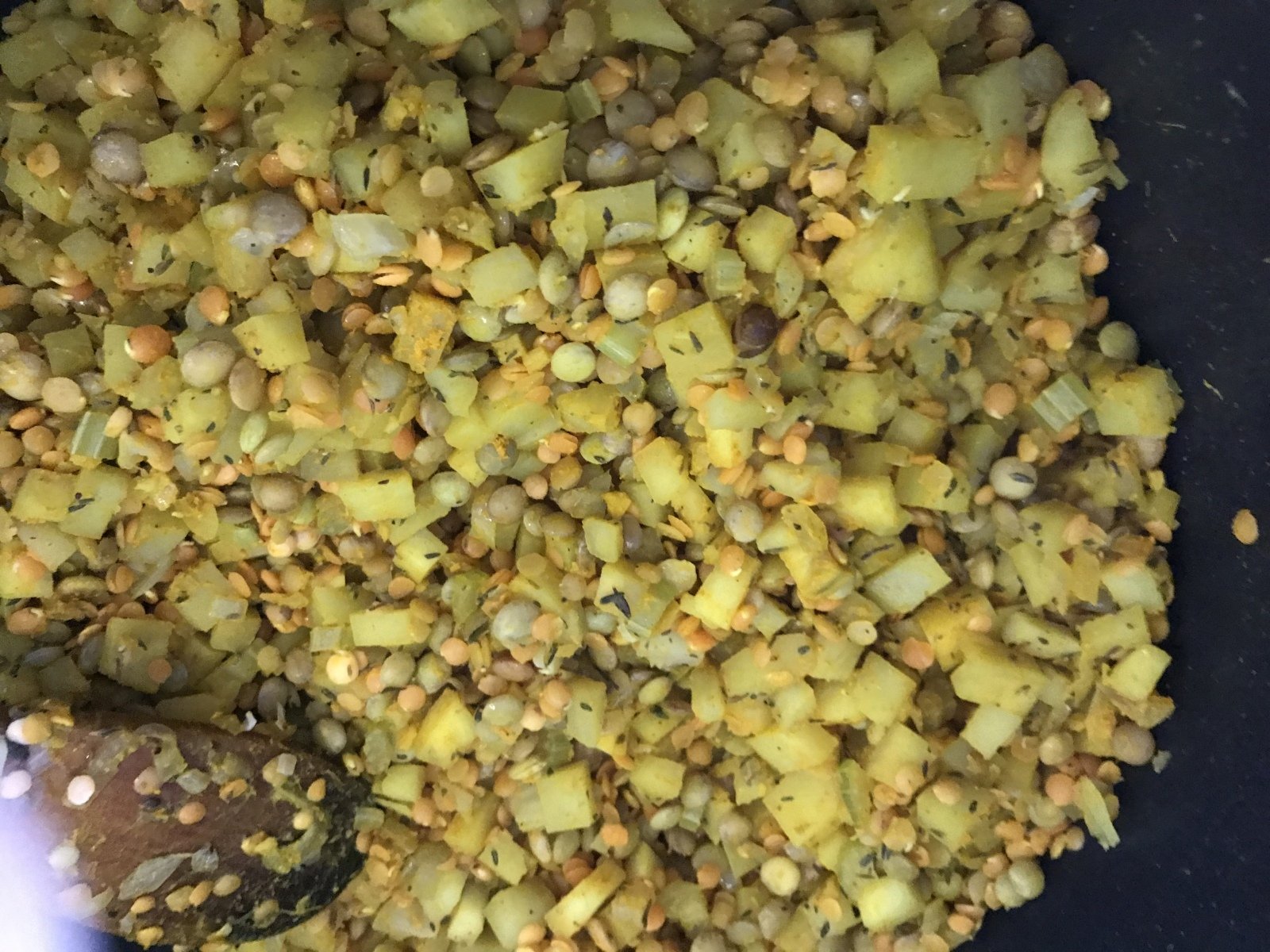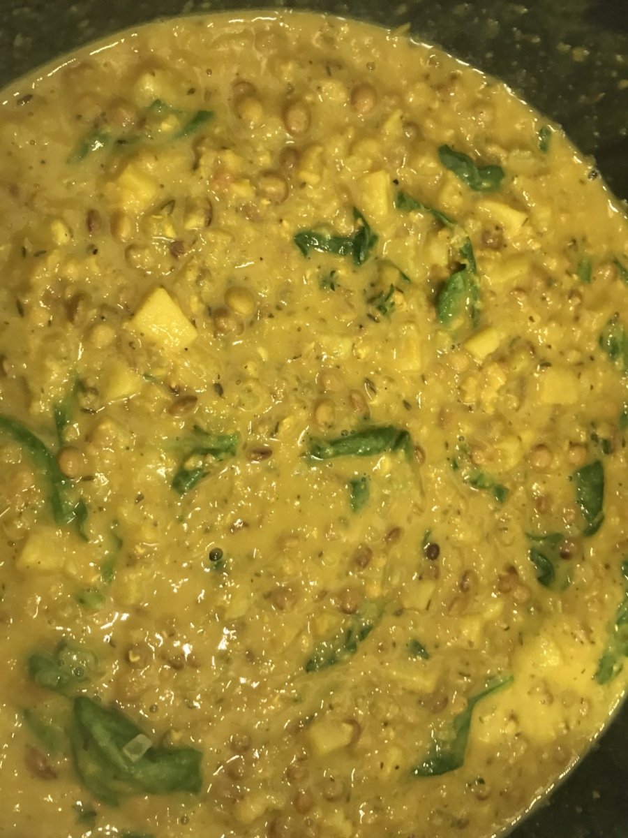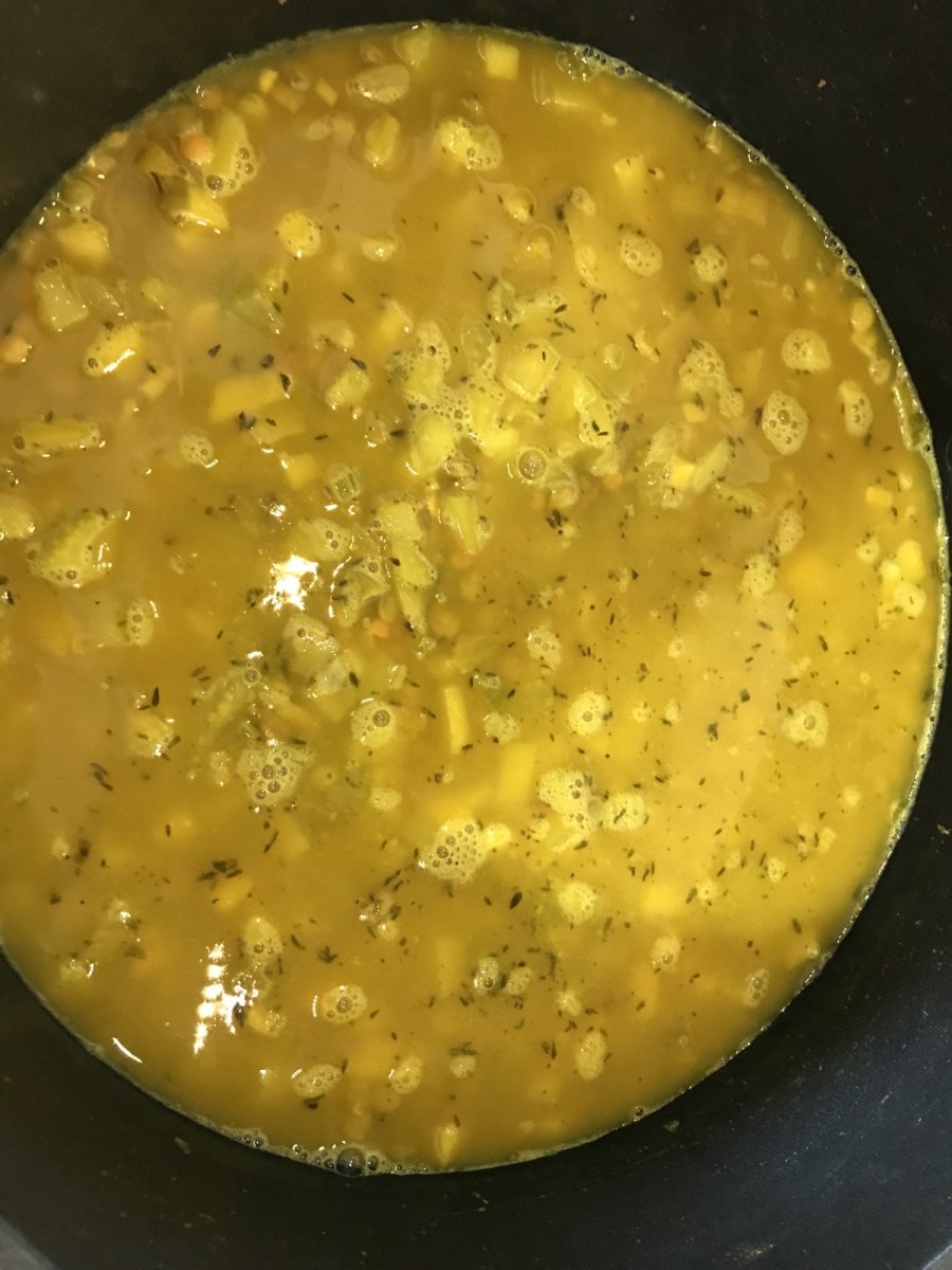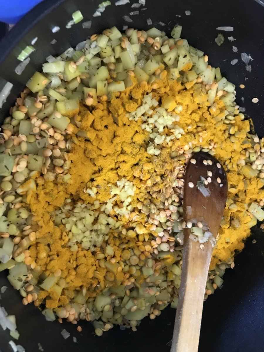 Agregar las lentejas (remojar 12 horas antes y cambiarles el agua varias veces), la cúrcuma, el jengibre y el comino y saltear por 1 a 2 minutos, luego agregar el caldo y el agua. Dejar hervir la sopa, cubrir y reducir a fuego lento durante 30 minutos.