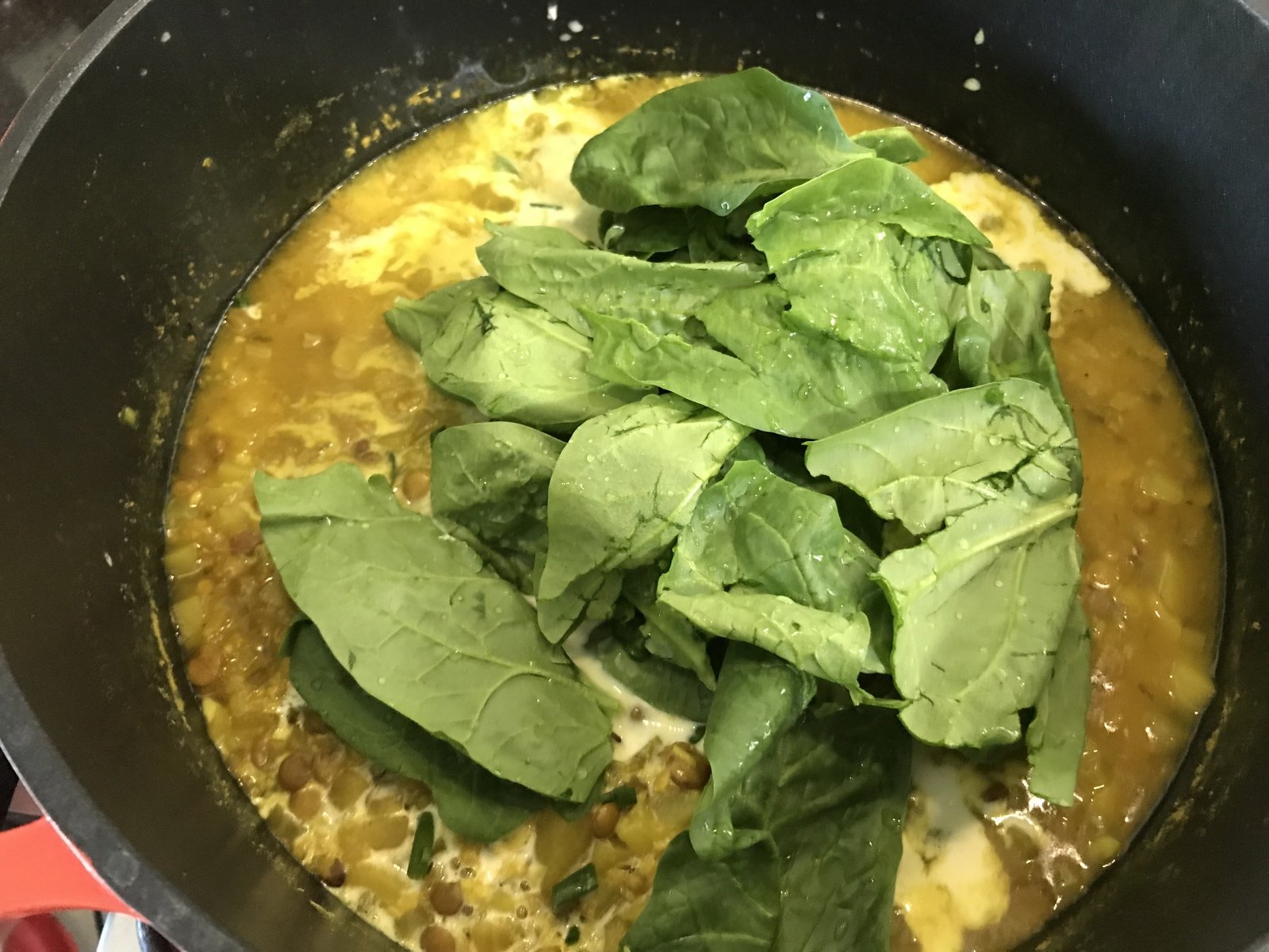 Retirar del fuego y agregar la leche de almendras, la espinaca, las hierbas, el limón y la pimienta hasta que la espinaca se haya marchitado.