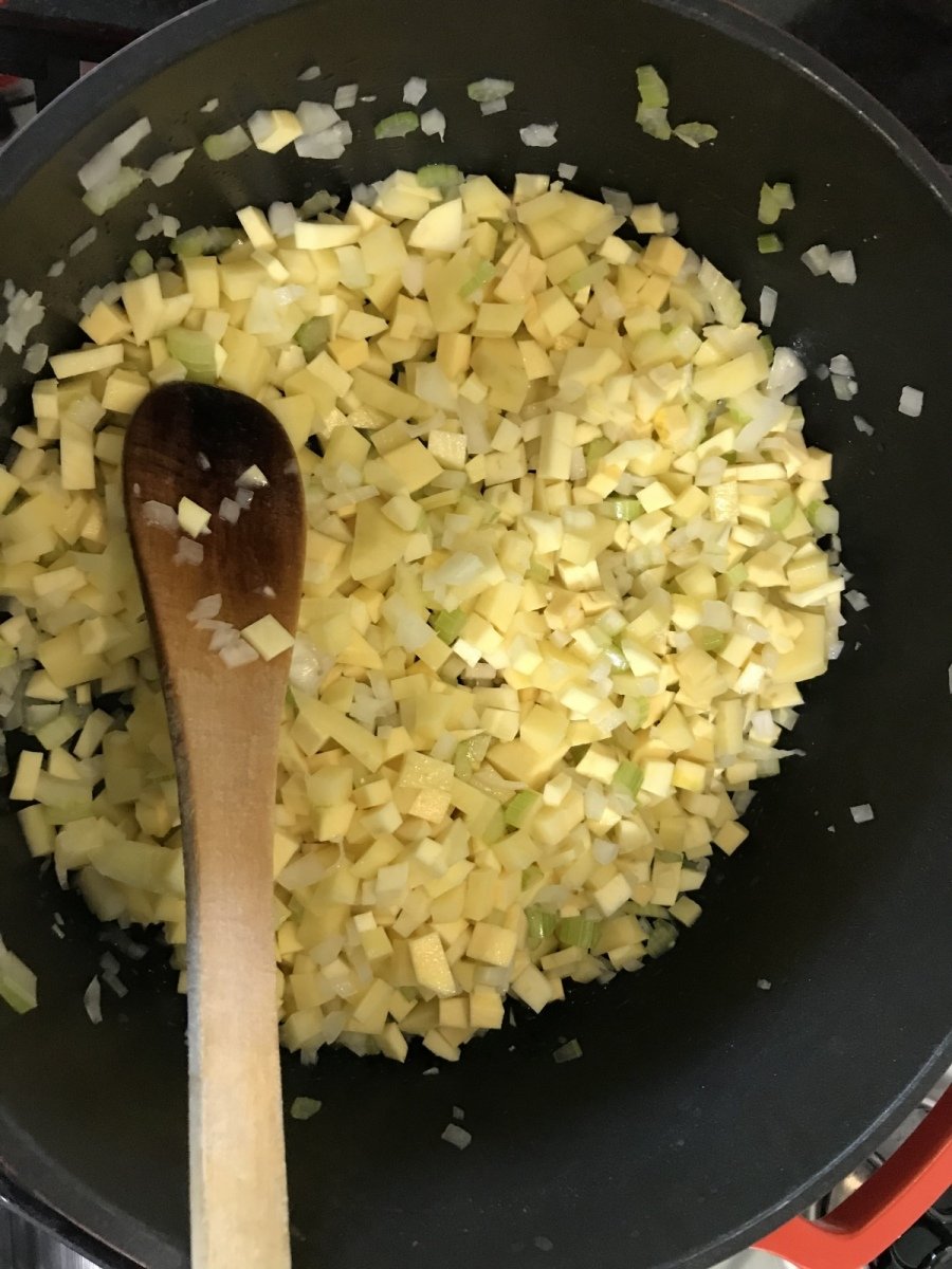 Calentar el aceite en una olla grande o en un dutch oven. Agregar las cebollas, el apio, la batata, la papa y el ajo y saltear durante unos 5 minutos hasta que todo se suavice ligeramente. Sazonar con sal, pimienta y tomillo y cocinar unos 2 minutos.