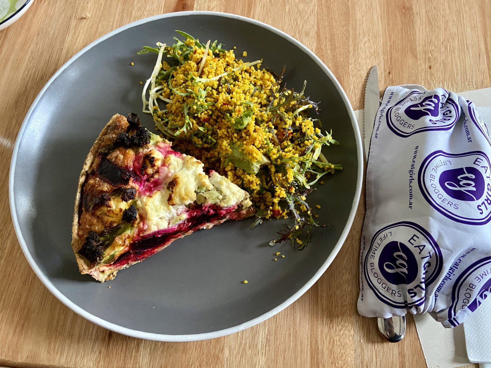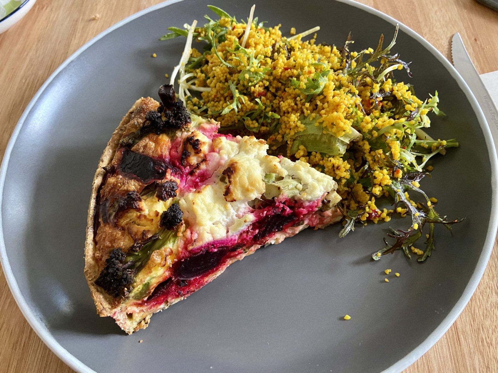 Una tarta de remolachas, brócoli y queso de cabra con ensalada de cous cous y verdes.