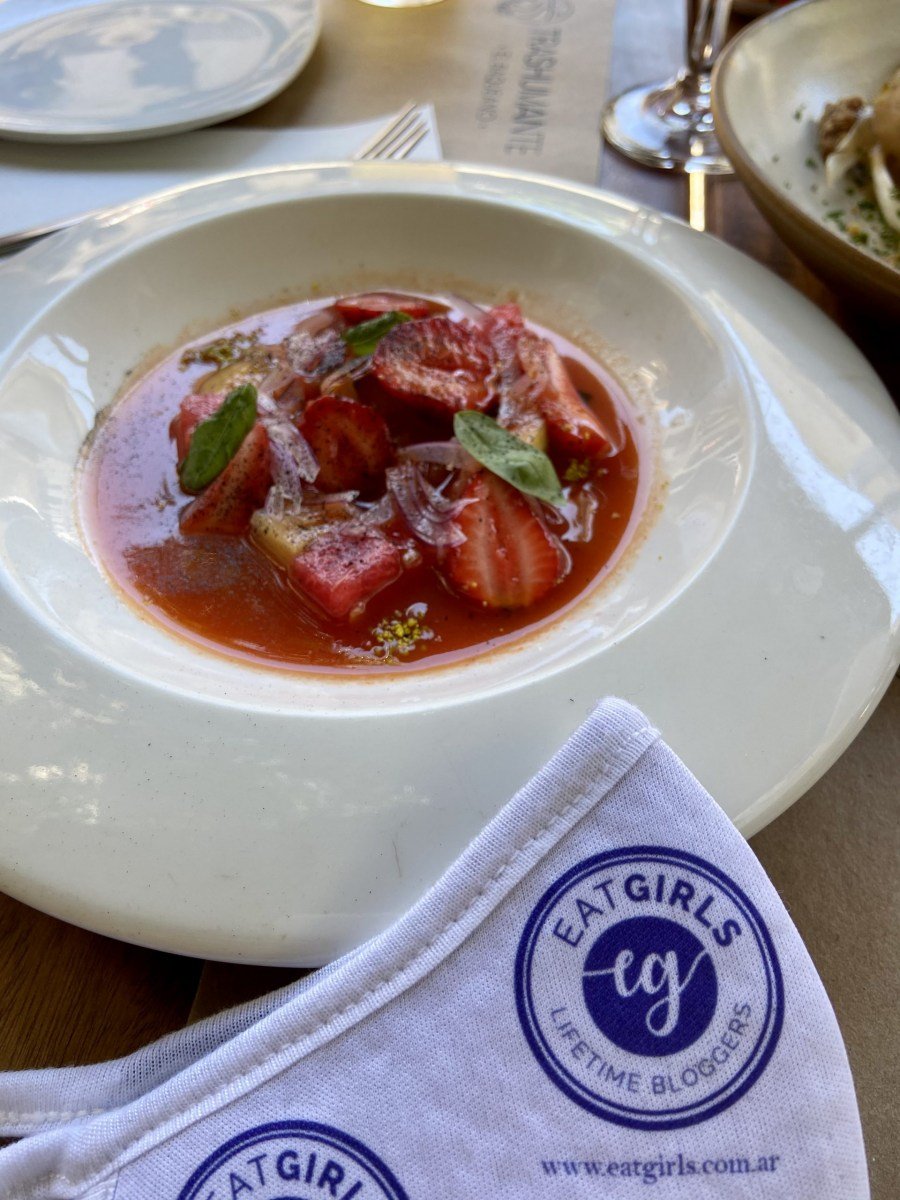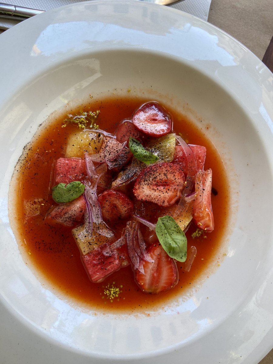 Pedimos el aguachile, ideal para refrescar un día como hoy: frutillas, sandía, tomate, con un punto ácido y uno ahumado delicioso.