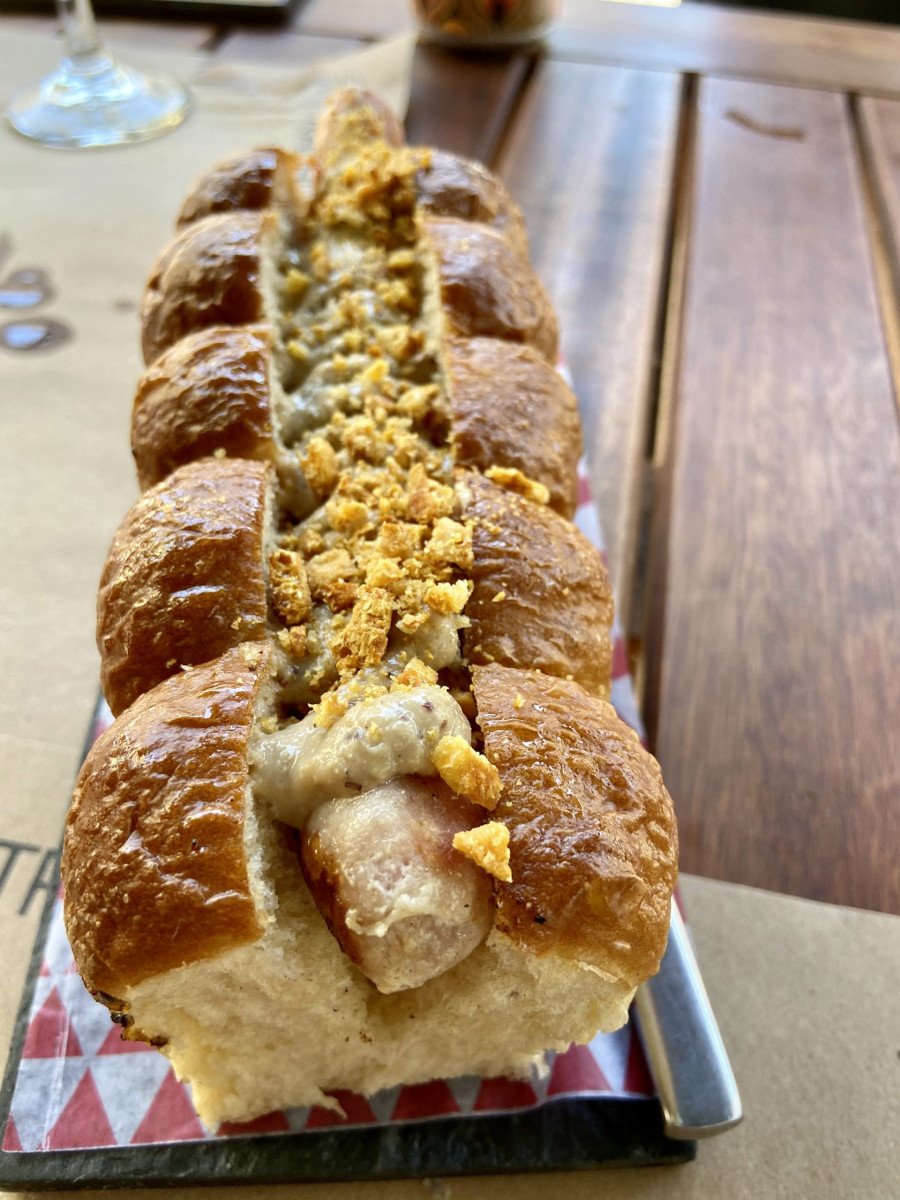 Hicimos una de más y pedimos la salchicha de jamón con mostaza a la antigua y chicharrón de cerdo. El pan un espectáculo: aireado, esponjoso abrazando una salchicha de Viena en su punto Justo.