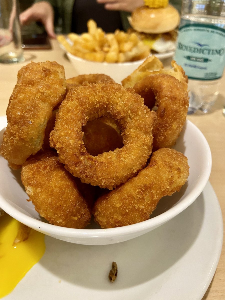 Pedimos dos hamburguesas Nebraska que estaban increíbles: medallón de carne, panceta, cebolla crispy, papas pay, cheddar, barbacoa acompañada de choclo asado. Buenísimo el punto de la carne, delicioso el pan, y nos vino con un upgrade de huevo a la plancha. Enormes hamburguesas que no pudimos terminar ninguna de las dos. Como acompañamiento podían ser papas fritas o aros de cebolla. Pedimos una de cada y ambos estaban perfectos. Los aros de cebolla riquísímos y bien empanados.