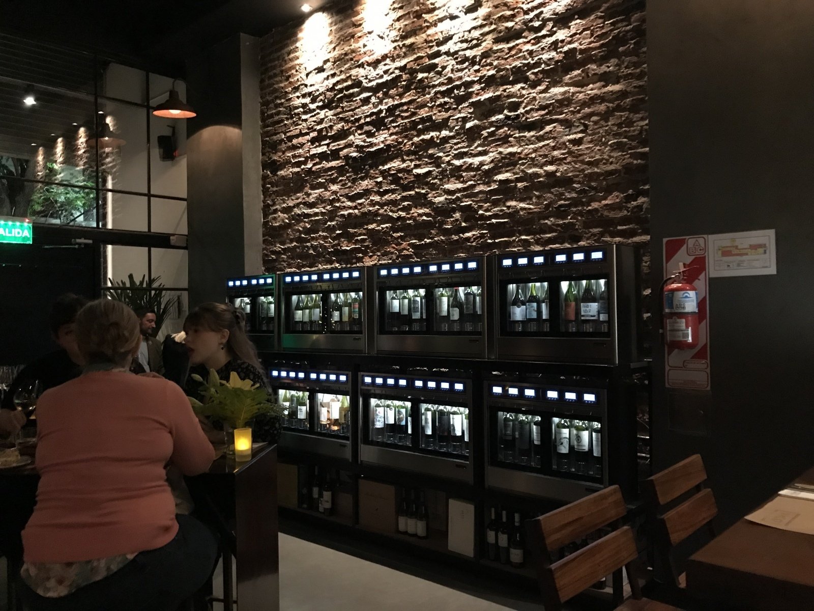 El salón súper acogedor: hay living adelante y mesas altas atrás con butacas CON respaldo. Los baños son en PB (muy importante por si te tentaste mucho y ya no podes subir por las escaleras). En el primer piso tienen un salón precioso con una mesa grande, tres pequeñas y un pequeño living. Ahí además tienen las máquinas con los vinos importados. Las máquinas son como una gran carta de vinos visual, ordenadas como tal, por cepas.